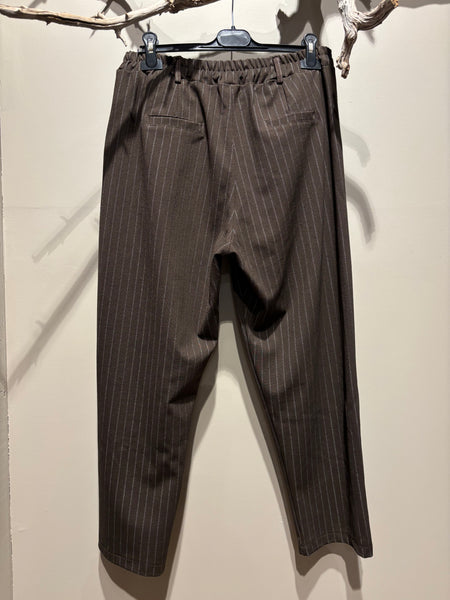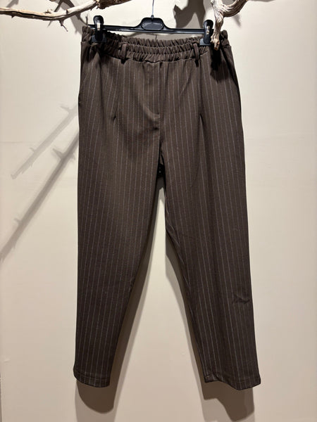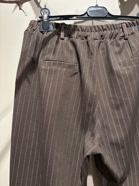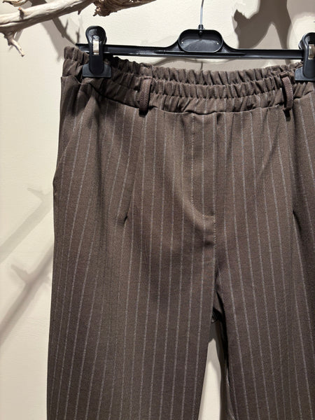 - "Emerald" brun kritstrecksrandig byxa med resår i midjan.