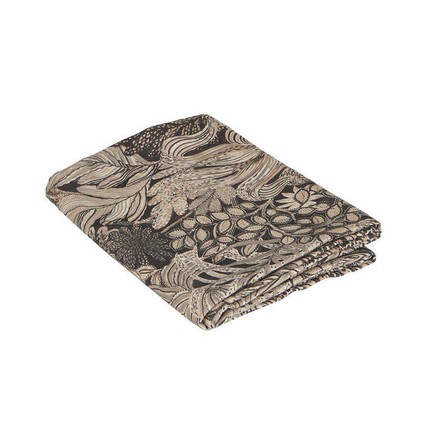 Duk "Farah", i fint bladmönster som breder ut sig över tyget som en levande målning, med stora, svepande former och djup i varje detalj. Färgtonerna är jordnära men samtidigt uttrycksfulla. Svart bottenfärg