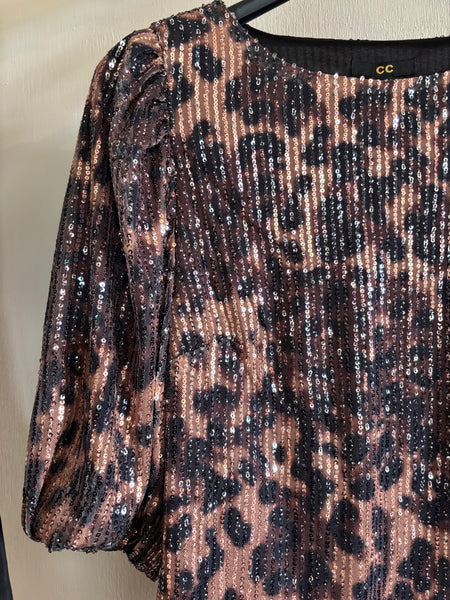 "Zaya" topp är en riktig partypingla där yttertyget är gjort i leopardmönstrad mesh med små paljetter. Toppen har en ledig passform med vid båtringad hals. Hela toppen är fodrad och i ärmen är fodret gjort lite kortare för att yttertyget ska blusa över och skapa extra volym.