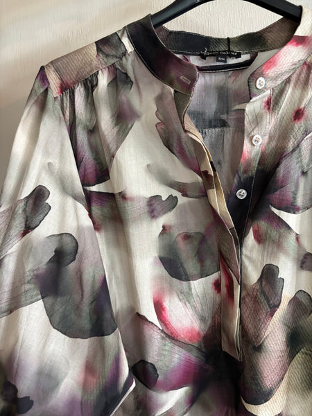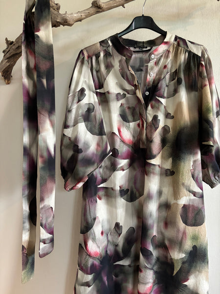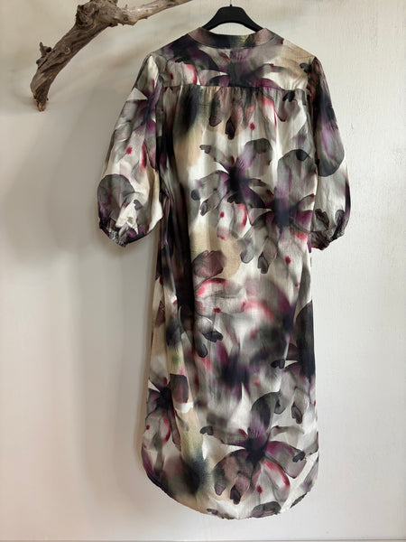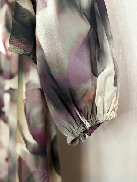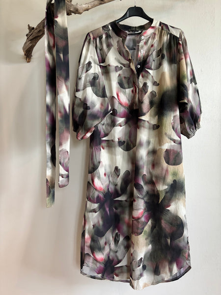 "Filora" klänning med knyt skärp och ballongärmar, i färgen plum flower