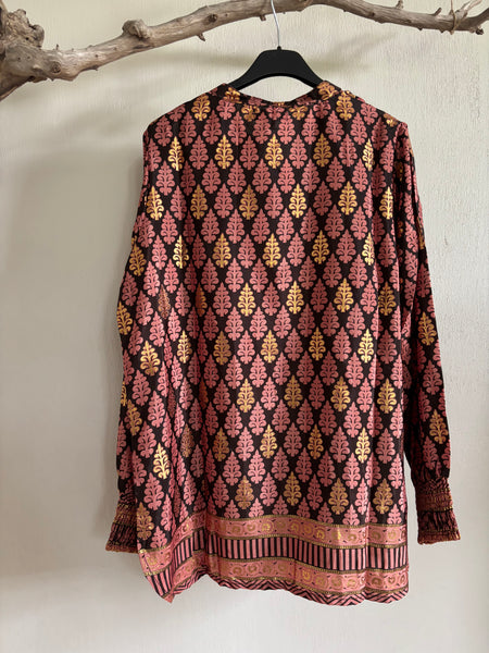 "Ella" blus i brun, rost/orange med guldiga inslag