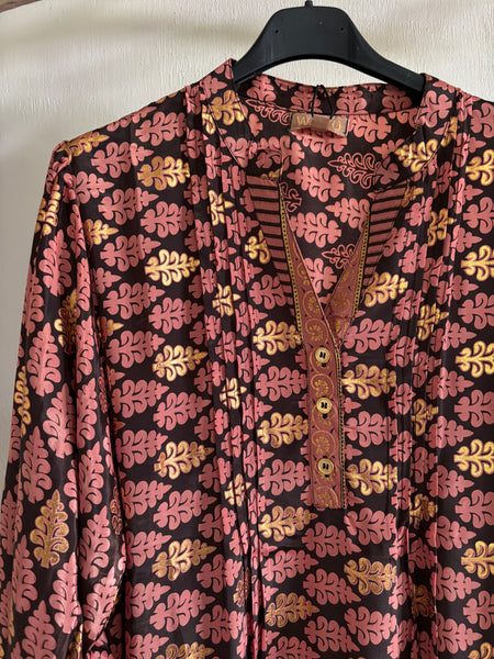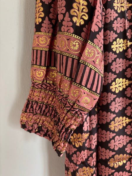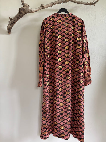 "Anja" klänningen brun och rost/orange mönstrad med guldiga inslag